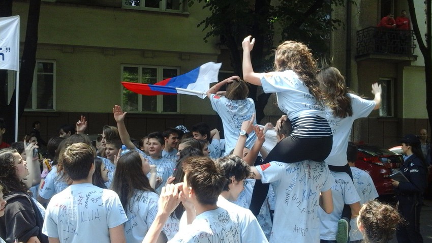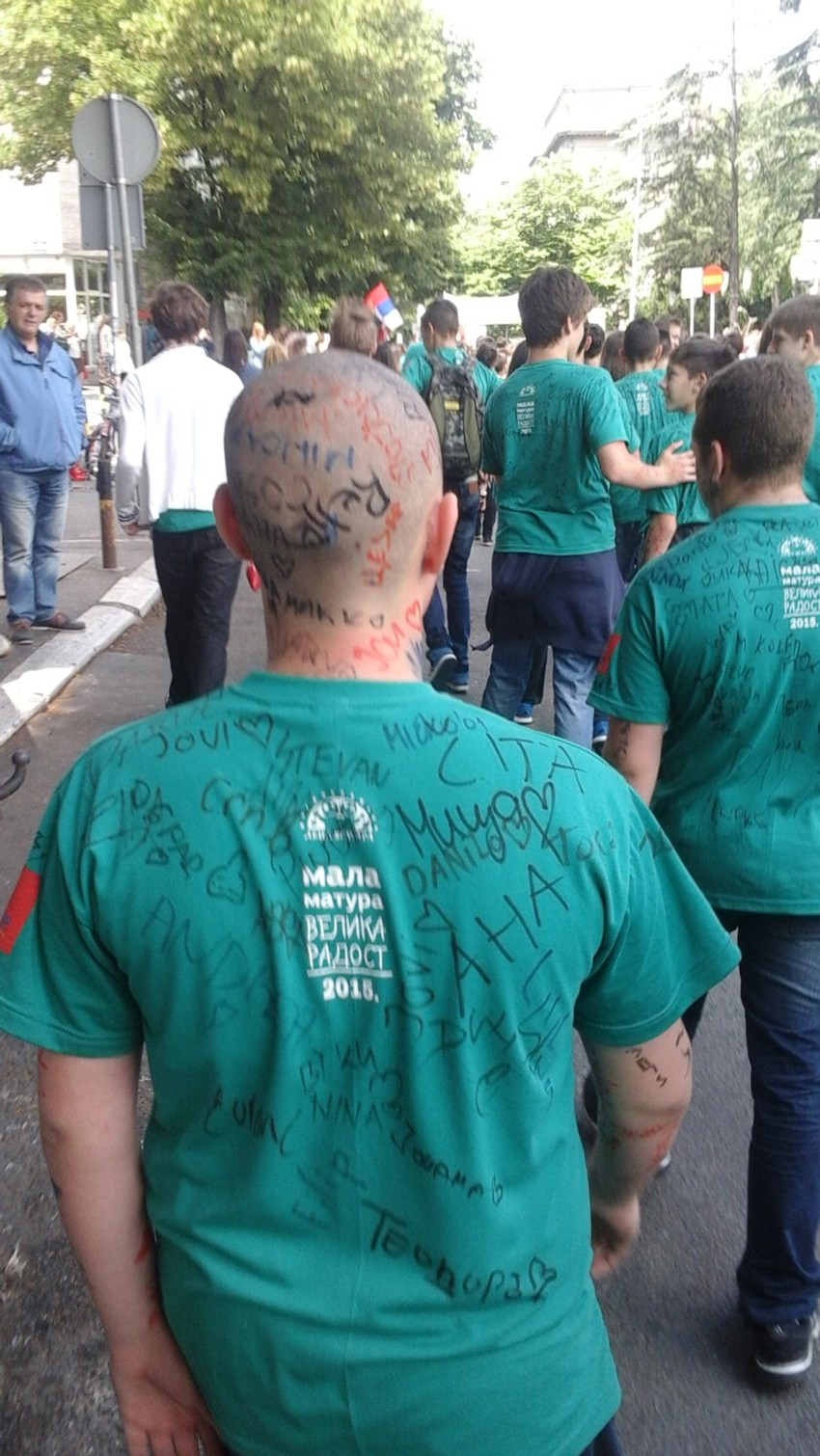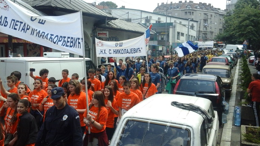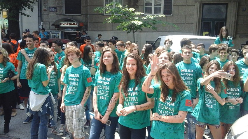 Maturanti osnovnih škola sa Vračara šetali su danas od Beogradskog dramskog pozorišta u Mileševskoj ulici do Cvetnog trga kako bi proslavili završetak osmogodišnjeg školovanja.