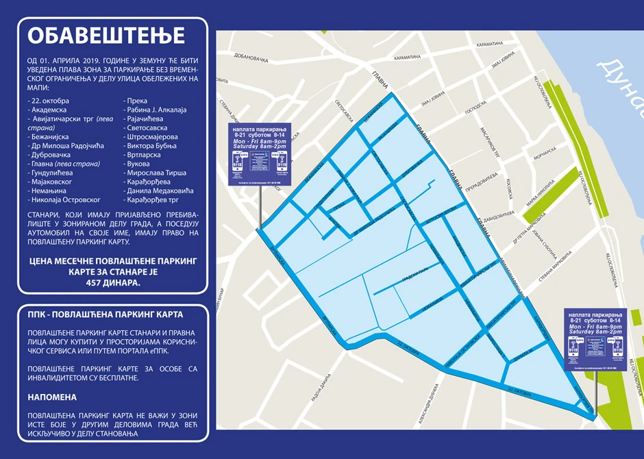 Ulice u kojima će se od sada naplaćivati parking su: 22. oktobra, Akademska, Avijatičarski trg (leva strana), Bežanijska, Dr Miloša Radojčića, Dubrovačka, Glavna (leva strana), Gundulićeva, Majakovskog, Nemanjina, Nikola Ostrovskog, Preka, Radbina J.Alkalaja, Rajčićeva, Svetosavska, Štrosmajerova, Viktora Bubnja, Vrtlarska, Vukova, Miroslava Tirša, Karađorđeva, Danila Medaković, Karađorđev trg.