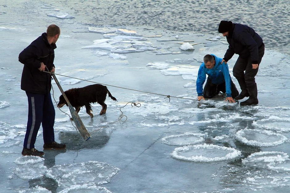 Ali ovaj lep prizor za slikanje uskoro se pretvorio u pravu dramatičnu akciju spasavanja. Pas je propao u vodu, a hrabri ljudi su sa veslom i kanapom u rukama krenuli za njim.