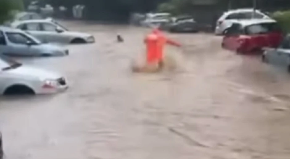 "Trči, trči, žena se davi!", uzvikuje muškarac koji snima, dok drugi trči ka ženi i spasava je iz bujice.
