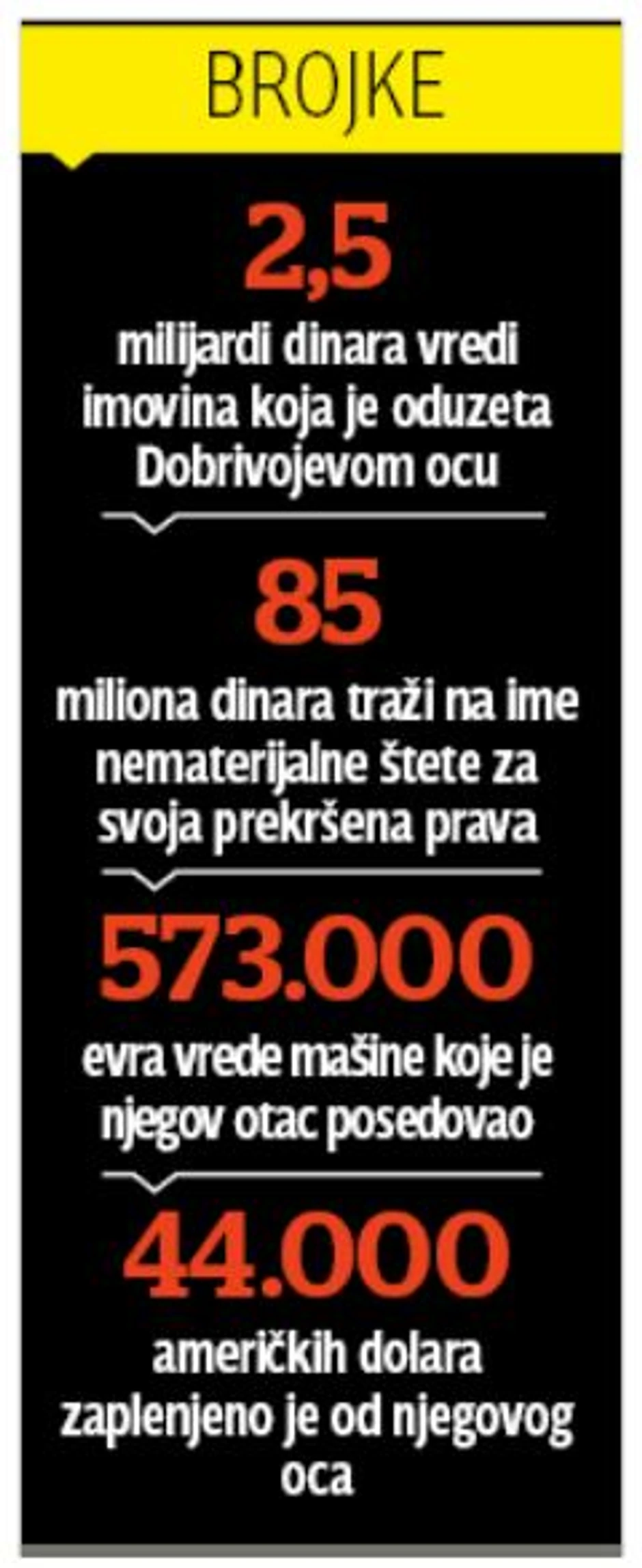 Sin je sada podneo odštetni zahtev u kom traži naknadu materijalne štete nastale oduzimanjem imovine od 2.475.885.330 dinara, kao i 85 miliona dinara zbog nemetarijalne štete prouzrokovane njegovim neosnovanim zatvaranjem, povredom ugleda i časti, povredom prava na roditeljski dom, povredom tajnosti, povredom prava na obrazovanje.