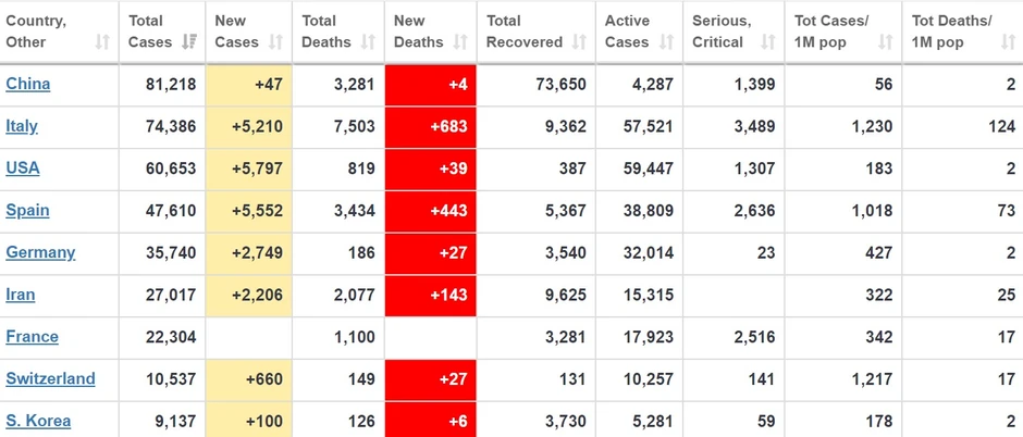 U Kini, iz koje je virus počeo da se širi po svetu, od početka epidemije je obolelo 81.285 osoba, preminulo 3.287, a trenutno je obolelo 3.947 osoba. Trenutno je najgora situacija u Italiji u kojoj je obolelo 74.386 osoba, a aktivno je 67.063 slučajeva i u kojoj je preminulo 7.503 osoba. Za njom slede SAD gde je obolelo 68.489 osoba, Španija (49.515), Nemačka (37.323), Iran (27.017), Francuska (25.233).