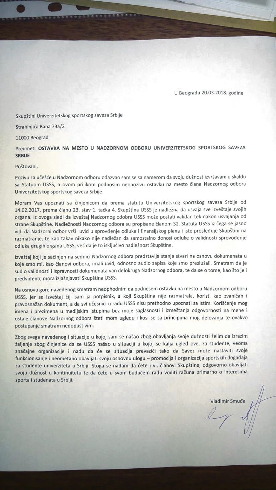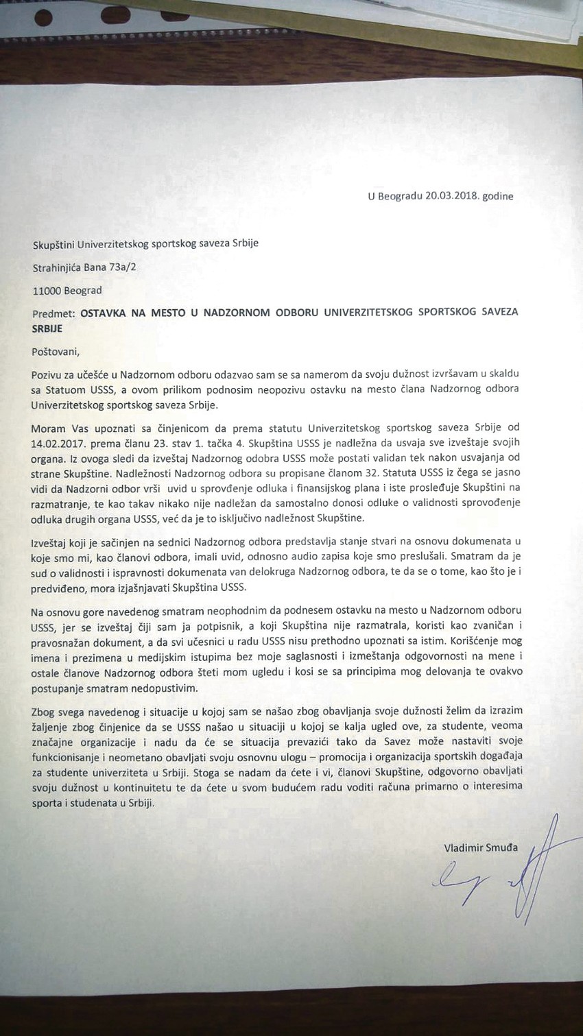 - Smatram neophodnim da podnesem ostavku na mesto u NO jer se izveštaj čiji sam potpisnik, a koji Skupština USSS nije razmatrala, koristi kao zvaničan i pravosnažan dokument a da svi učesnici u radu USSS nisu prethodno upoznati sa tim. Korišćenje mog imena i izmeštanje odgovornosti na mene i ostale članove NO šteti mom ugledu i principima mog delovanja - kaže Smuđa u ostavci koju je dostavio Skupštini USSS.