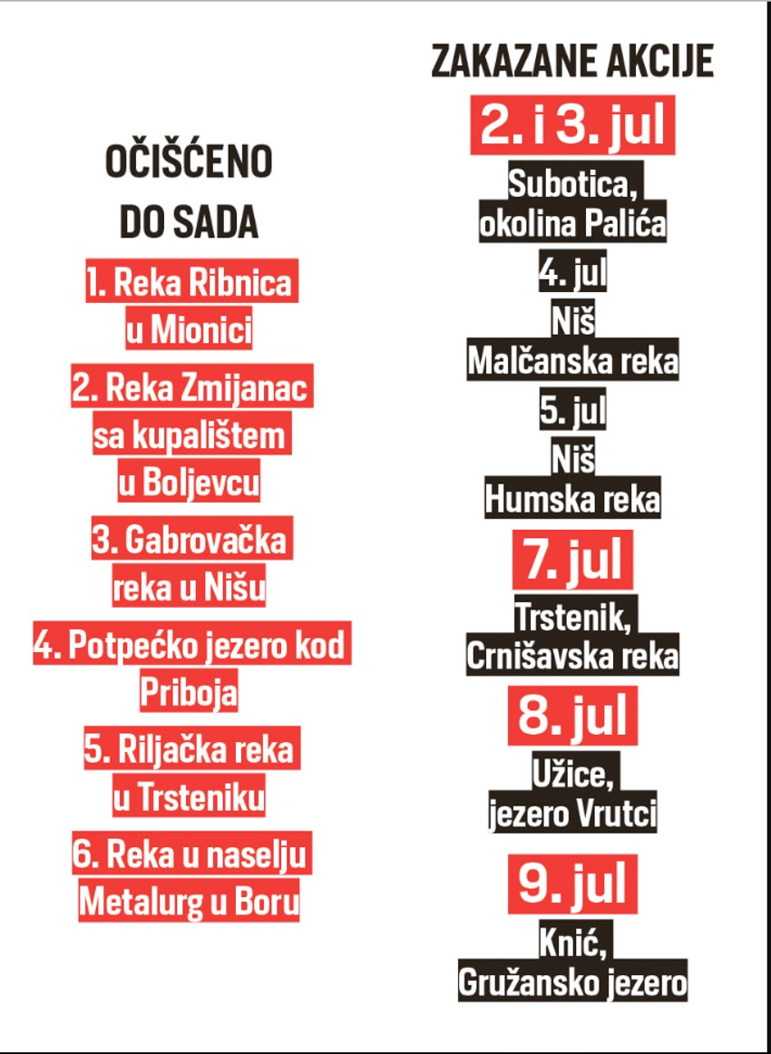 Narednih dana objavljivaćemo precizne termine kada će se koja lokacija čistiti te se akciji mogu priključiti građani, ekološke organizacije, udruženja i preduzeća, svako kako može. Svi koji žele da pomognu mogu da kontaktiraju sa nama putem mejla cistereke@ringier.rs ili telefona 011/333-4-597.