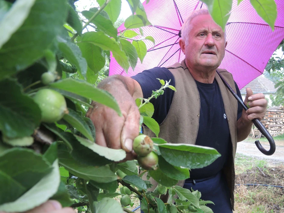 Zatim su krenule krupnije. Sa istog mesta gde sedimo gledao ih je dan ranije kako zasipaju dvorište i odskaču po metar uvis kao teniske loptice. Ono što nije video tada samo je naslutio – da će mu grad pobiti letinu. Mislio je na njegova 2,3 hektara pod malinom za branje na sedam parcela, onaj hektar tek posađen holandskim sadnicama, pet hektara jabuke. Sa njima su na milost i nemilost pomahnitalom nebu bile ostavljeni Radenkovi šljivici i njive sa kukuruzom, krompirom.