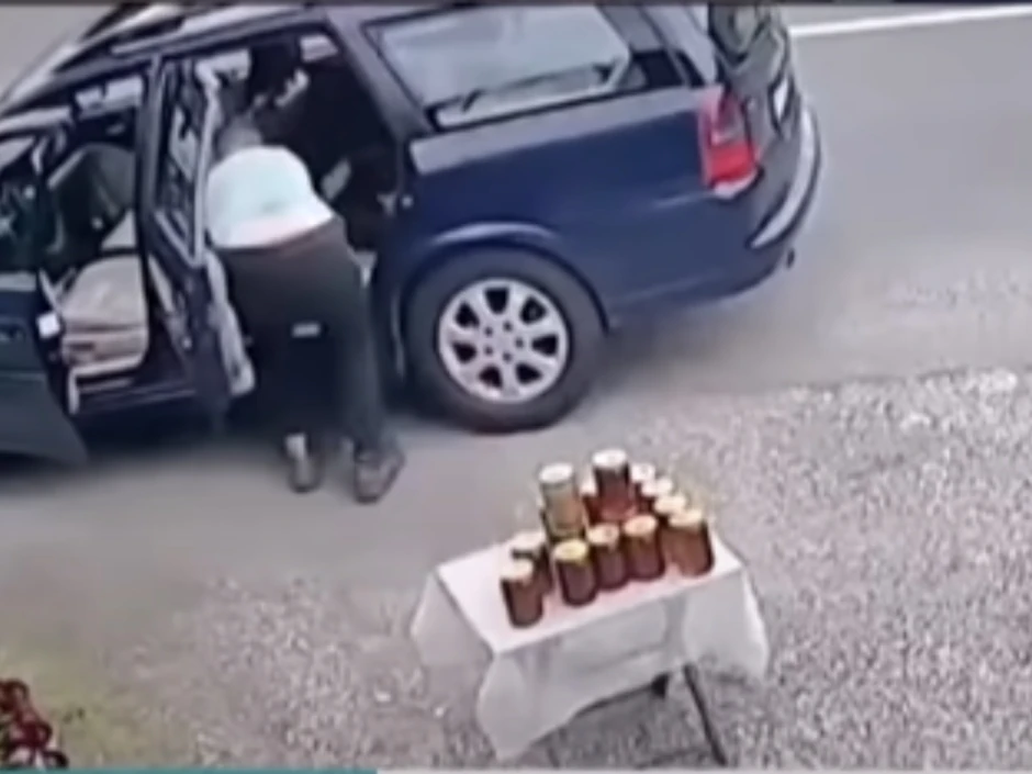 Nepoznati muškarac zaustavio je tamnoplavi karavan pored puta, izašao iz vozila i u svega nekoliko sekundi ukrao više tegli domaćeg meda koje su bile izložene na improvizovanoj tezgi ispred jednog dvorišta.