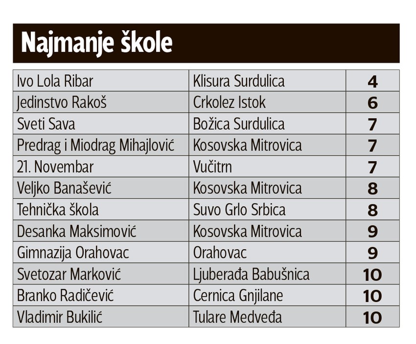 U školama na KiM, situacija sa brojem učenika je poražavajuća. Prema podacima Mministarstva prosvete, u osam osnovnih i srednjih škola, ima manje od deset učenika. Čak u dve škole u Kosovskoj Mitrovici, "Predrag i Miodrag Mihajlović" i "Veljko Banašević" ima po osam učenika. Situacija u pojedinim srednjim školama je još teža. Gimnazija u Orahovcu ima samo devet učenika, dok Tehnička škola u Srbici ima osam đaka.