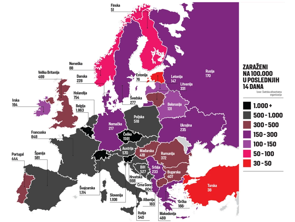 U Evropi nema zemlje u zelenoj ili žutoj zoni, a u najboljem položaju je Turska sa 37 zaraženih na 100.000 stanovnika i ona je u crvenoj zoni.