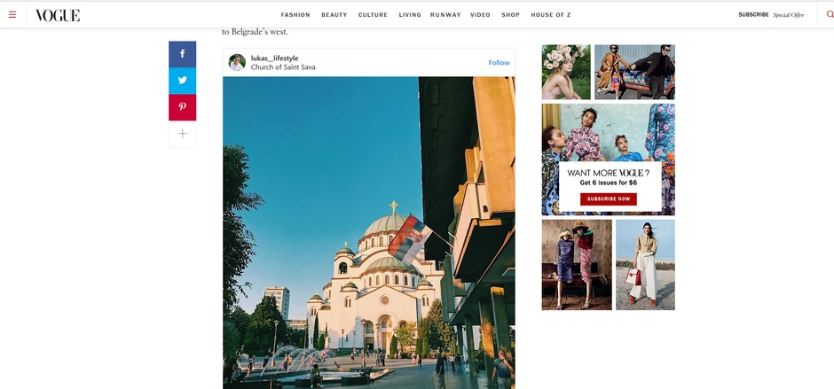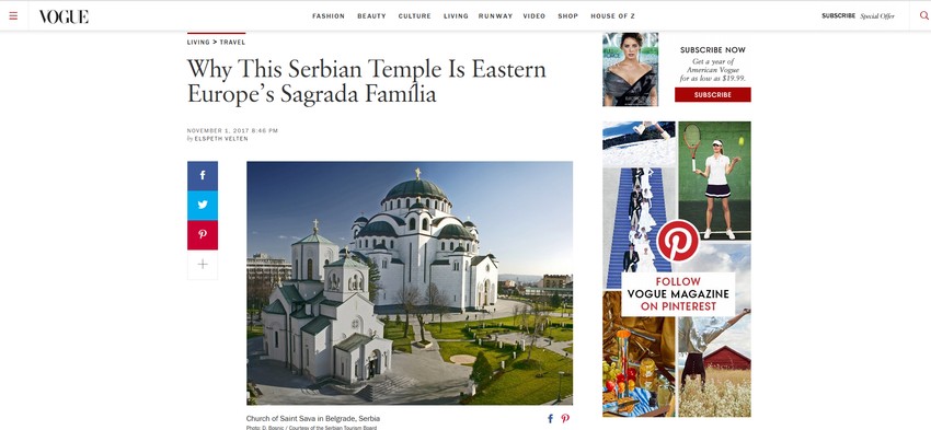 Hram Svetog Save u Beogradu je istočnoevropska Sagrada familija i drugi najveći pravoslavni hram na svetu, piše američki magazin "Vog" (Vogue).