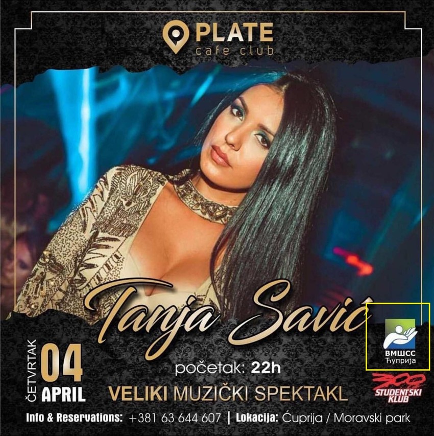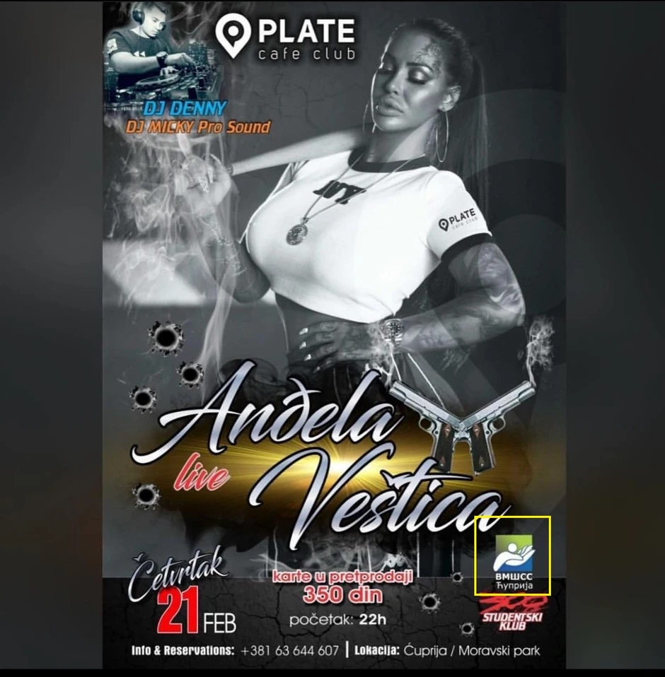 Kako se vidi na fotografijama reklamnih panoa i bilborda koji su pozivali na nastup Tanje Savić i Anđele Veštice stoji logo “VMŠSS Ćuprija”.