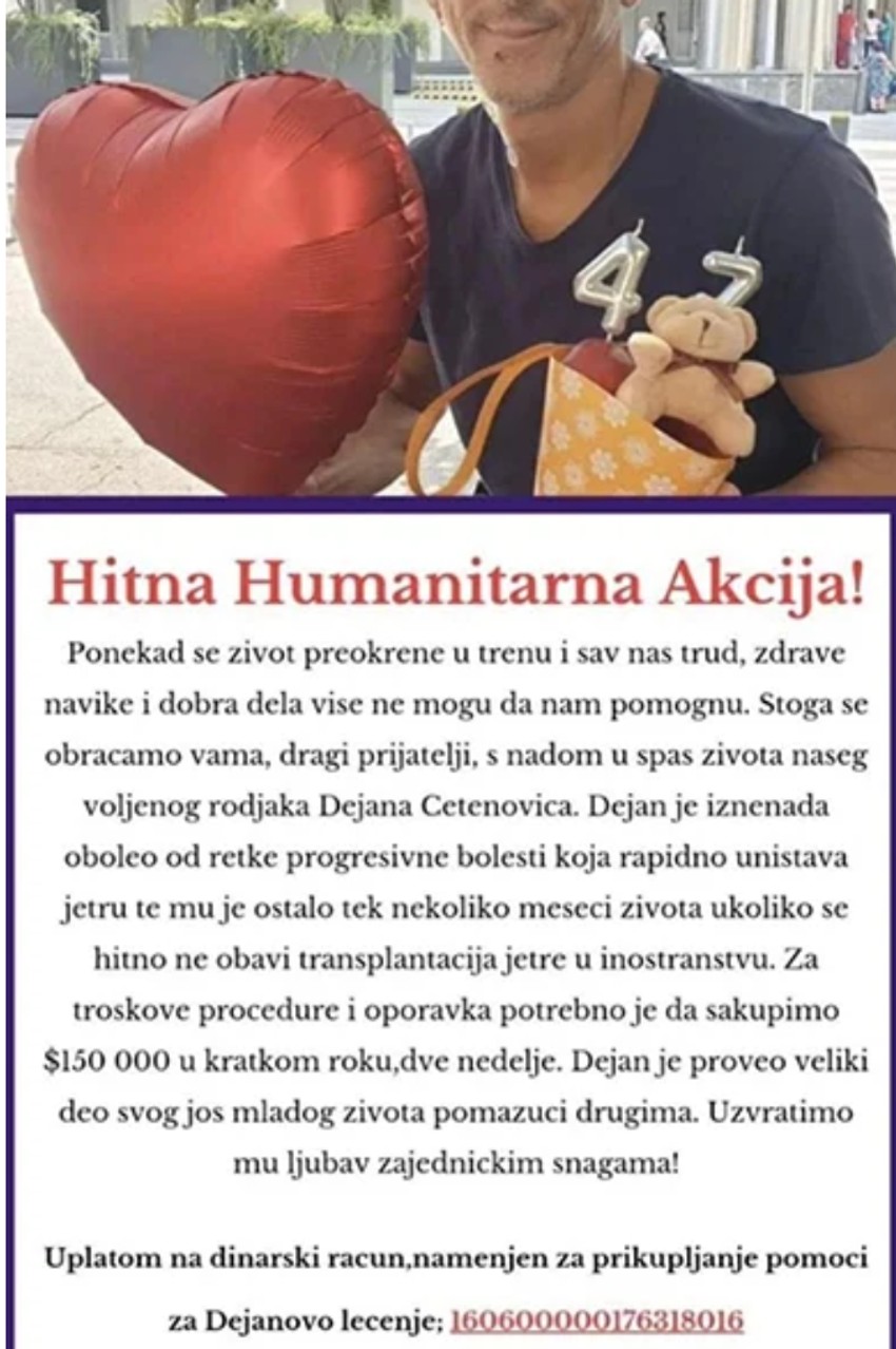 Naime, Dejan je iznenada oboleo od retke progresivne bolesti koja mu rapidno uništava jetru, te mu je ostalo tek nekoliko meseci života ukoliko se ne obavi hitno transplatacija u inostranstvu.
