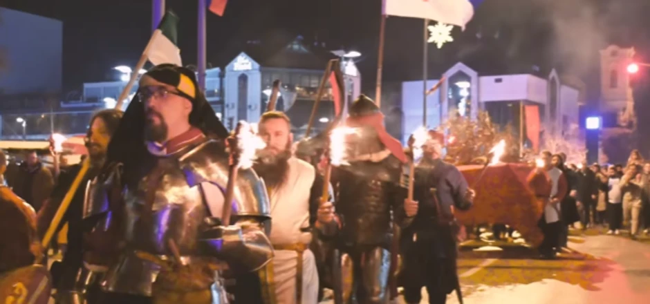 Kako se vidi na snimcima objavljenim na društvenim mrežama ljudi su u povorci obučeni kao vitezi iz srednjovekovne Srbije sa srpskom trobojkom, šlemovima i štitovima, bakljama i mačevima.