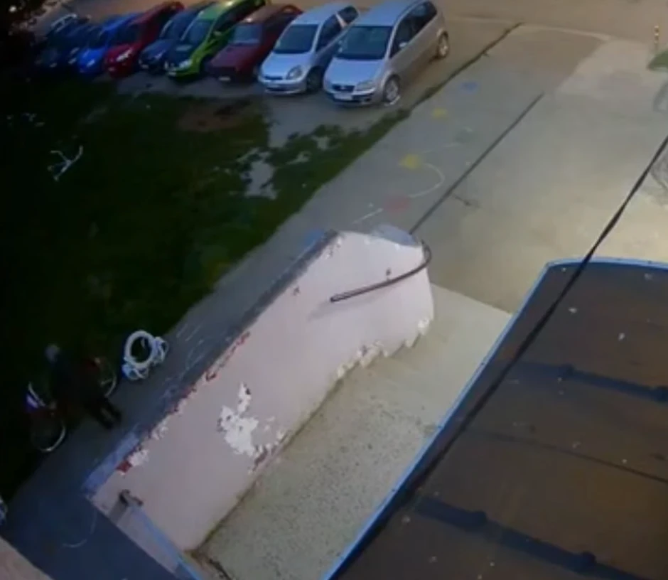 Na snimku se jasno vidi kako starija ženska osoba silazi sa bicikla i krade žardinjere zasađene cvećem ispred ulaza u stambenu zgradu.