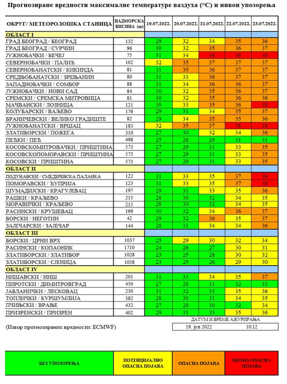 Na pomenutom sajtu istaknuti su i očekivani termički uslovi i nivoi upozorenja za period od 19. do 23. jula, pa su tako tokom 21, 22. i 23. jula u Južnobačkom okrugu (Bečej) prognozirane maksimalne temperature vazduha od 38 stepeni, dok će tom ovom periodu u ovom delu Srbije na snazi biti veoma opasni vremenski uslovi, sudeći prema crvenoj boji kojom su ti dani obeleženi.
