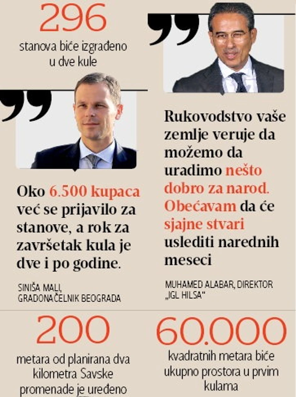 Prva lopata udarila je po tlu na kome je planirano da nikne poslovno-stambeni kompleks “Beograd na vodi“, a premijer Srbije Aleksandar Vučić i direktor kompanije “Igl hils” Muhamed Alabar postavili su kamen temeljac za gradnju prve dve stambene zgrade i svečano su otvorili Sava promenadu. Dve stambene kule imaće 296 stanova, odnosno oko 60.000 kvadratnih metara, a prodaja stanova, po principu registracije zainteresovanih za kupovinu, počinje 3. oktobra. Stanovi će biti jednosobni, dvosobni i četvorosobni. Kako “Blic“ saznaje, cena najjeftinijeg kvadrata biće 2.500 evra, dok će kvadrat stanova sa pogledom na reku koštati 3.000 evra.