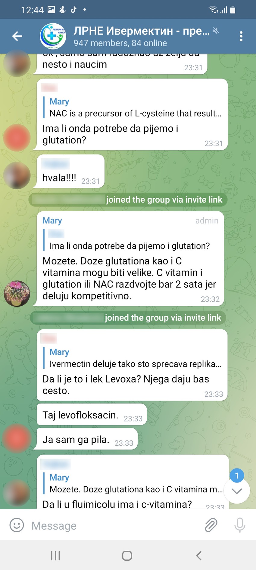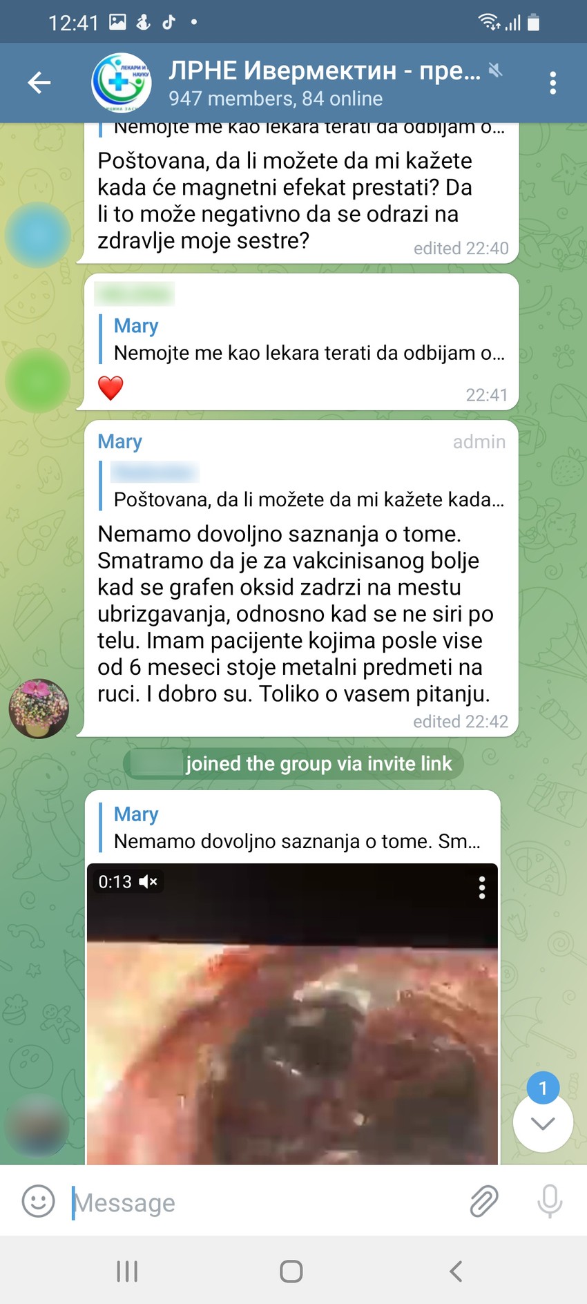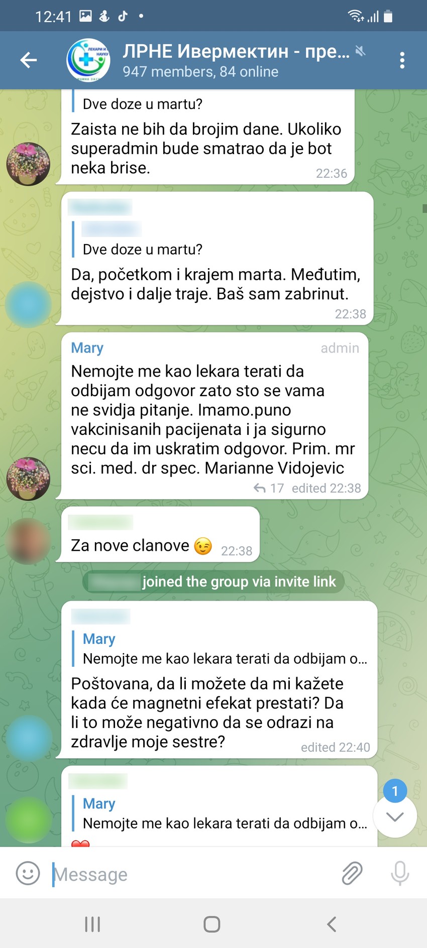 Dok se 18 lekara koji su savetovali i promovisali neregistrovani lek protiv kovida nalazi pred sudom časti Lekarske komore Srbije, deo aktivnosti sa vajber grupe posvećene ivermektinu nastavljen je na društvenoj mreži Telegram. U moru neproverenih i opasnih saveta, pre dva dana pojavio se još jedan "biser" među lekarima - prim. dr Marianne Vidojević, koja je u noći svog "dežurstva" na pomenutoj grupi, uporno se ograđujući od lečenja putem interneta, kako ju je savetovao advokat, između ostalog komentarisala i čuvenu "namagnetisanu kašiku" zalepljenu na ruku osobe vakcinisane kovidom 19.