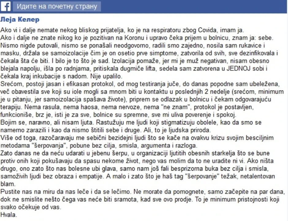 Pustite nas na miru da nas leče i da se lečimo. Ne morate da pomognete, samo začepite na par dana, dok ne smislite nešto čega vas neće biti sramota, kad sve ovo prođe. To je minimum pristojnosti koji svako očekuje od vas.