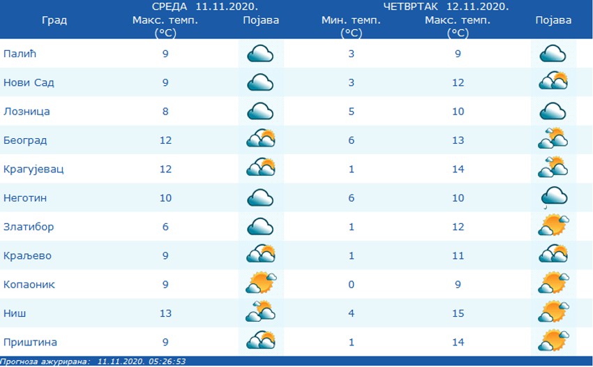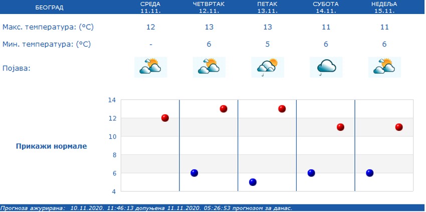 Jutarnja temperatura od 2 do 6 stepeni, najviša dnevna oko 12. Prema najavama meteorologa u petak i subotu moguća je kiša. Temeratura će se u prestonici tokom sutrašnjeg dana kretati od pet do 13 stepeni, dok će za vikend biti nešto hladnije, a živa u termometru neće prelaziti 11 podeok.