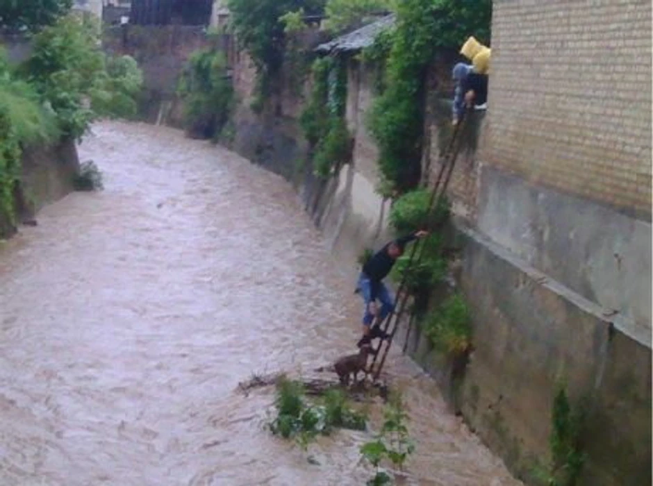 Mladići su od ljudi koji žive u obližnjim kućama pozajmili merdevine i zamolili ih da uđu u njihovo dvorište sa kojeg je bilo najlakše da se priđe psu. Pas je očajnički pokušavao da se spasi, ali nije imao za šta da se uhvati i sam izvuče na površinu. Mladići su uspeli da dopru do njega i konačno ga izvuku na suvo!