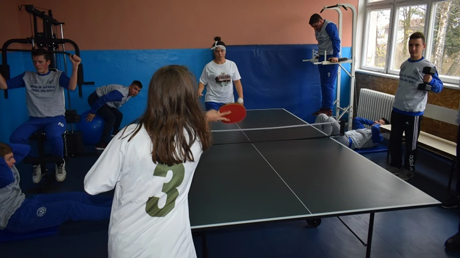 Konačno su dočekali čas fizičkog u toplom prostoru. Zasukali su rukave, okrečili zidove, postavili novi pod, sprave za vežbanje, strunjače, igraju i stoni tenis. Od učionice napravili su vežbaonicu. Tu je i kabinet za fizičko. Za koji dan biće završena i medijateka.