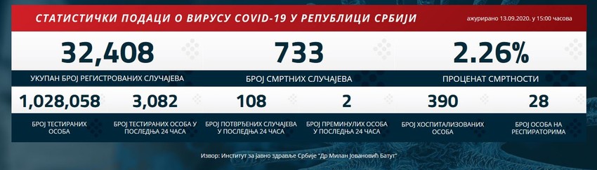 U poslednja 24 sata u Srbiji su na korona virus testirane 3.082 osobe, njih 108 bilo je pozitivno, dok su nažalost, preminula dva lica. Podsetimo, tokom jučerašnjeg dana imali smo skoro duplo više testiranih ljudi (6.068), ali i znatno manje pozitivnih (72).