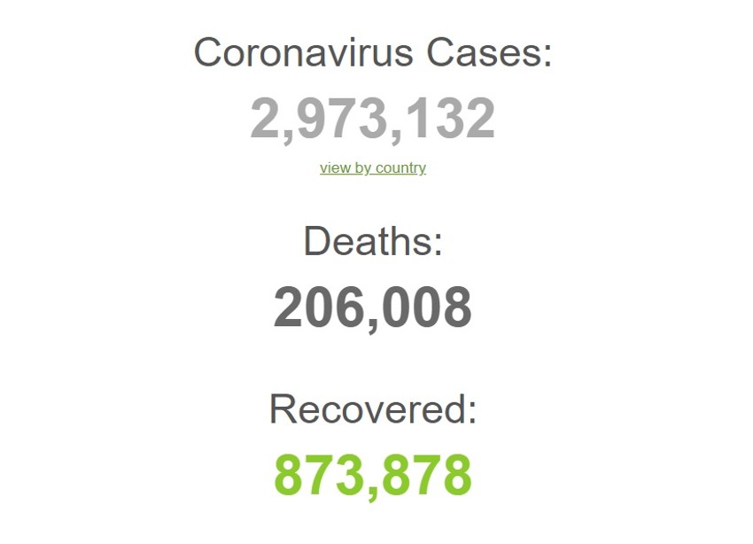 U svetu je blizu tri miliona ljudi zaraženo korona virusom, a samo u SAD ih je skoro milion. Prema najnovijim podacima sajta Worldometers, u svetu je zaraženo 2.973.132 osobe, a najgora situacija je u SAD, koje imaju najviše zaraženih - 975.798 i najviše preminulih - 54.941.