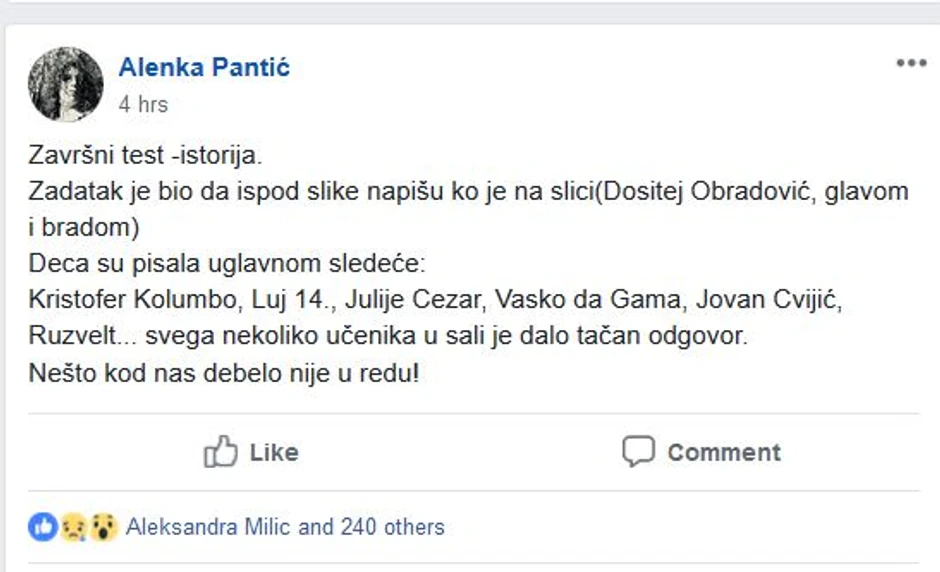 Ona navodi da je "ovaj primer sa slikom Dositeja Obradovića poražavajući rezultat nivoa znanja", a da je jedan od uzroka u "loše osmišljenom sistemu obrazovanja" u kom prosvetari "previše pažnje moraju da posvećuju administraciji".