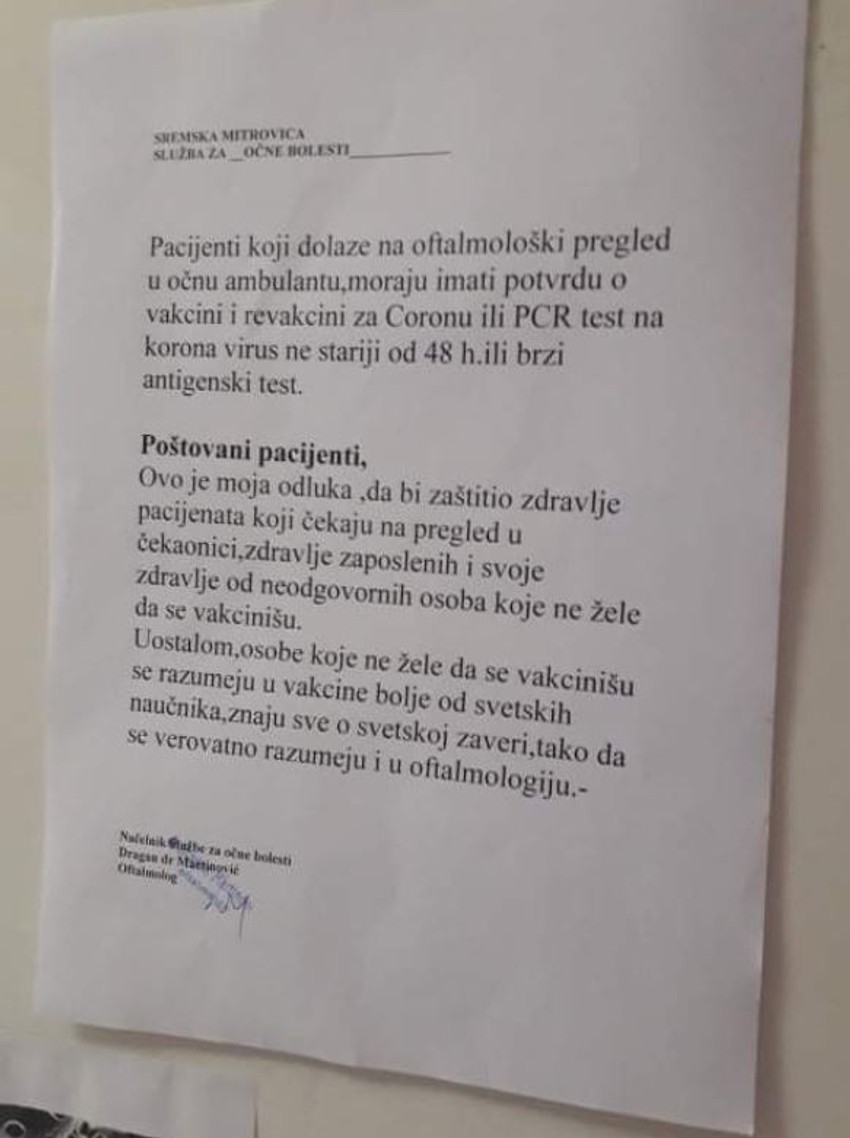 Obaveštenje iz jedne oftamološke klinike u Sremskoj Mitrovici, koje je načelnik tog odeljenja definisao kao svoju odluku, nakon brojih komentara na društvenim mrežama, uklonjeno je sa vrata ove ustanove.