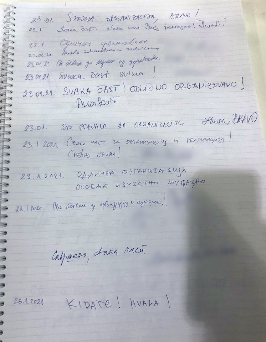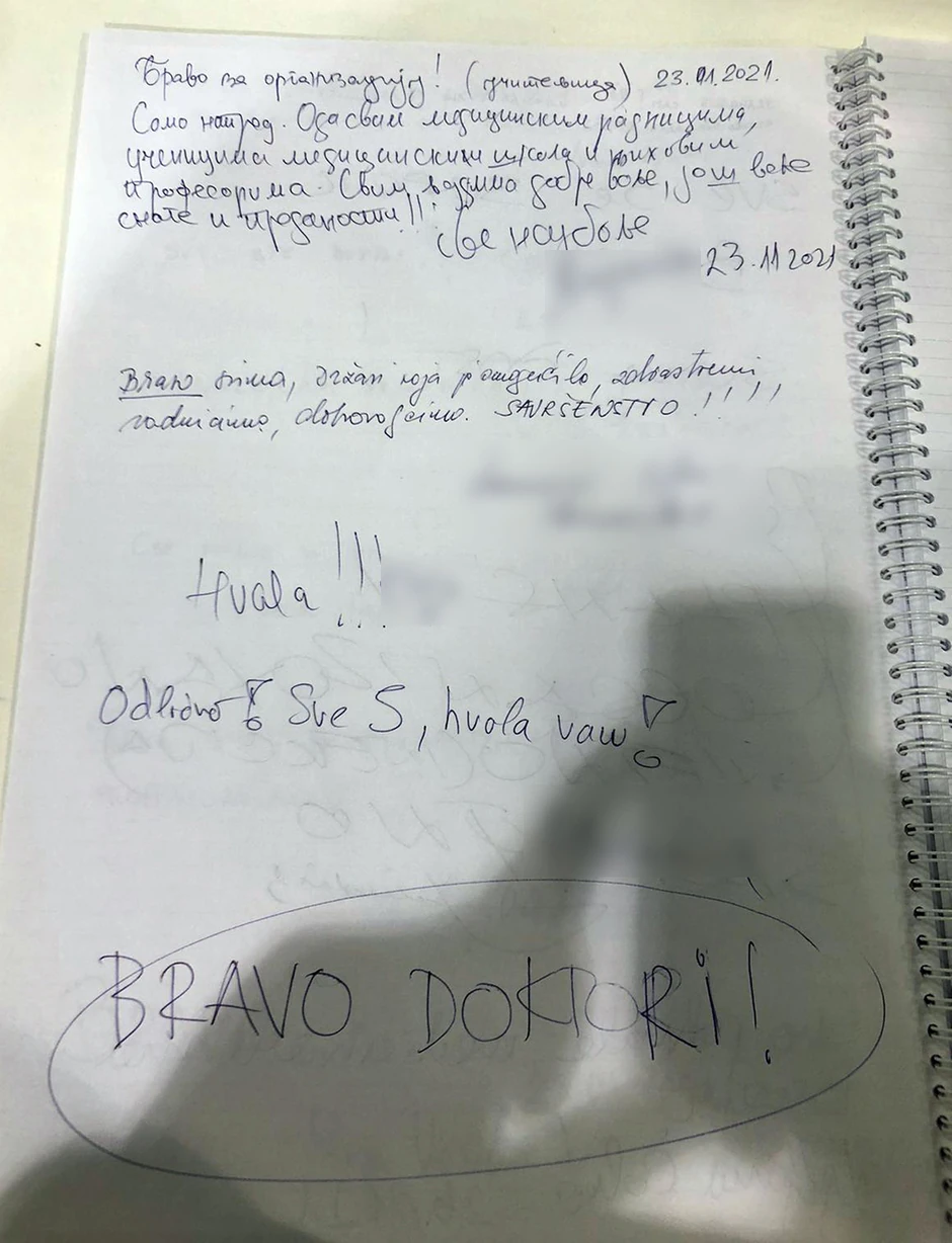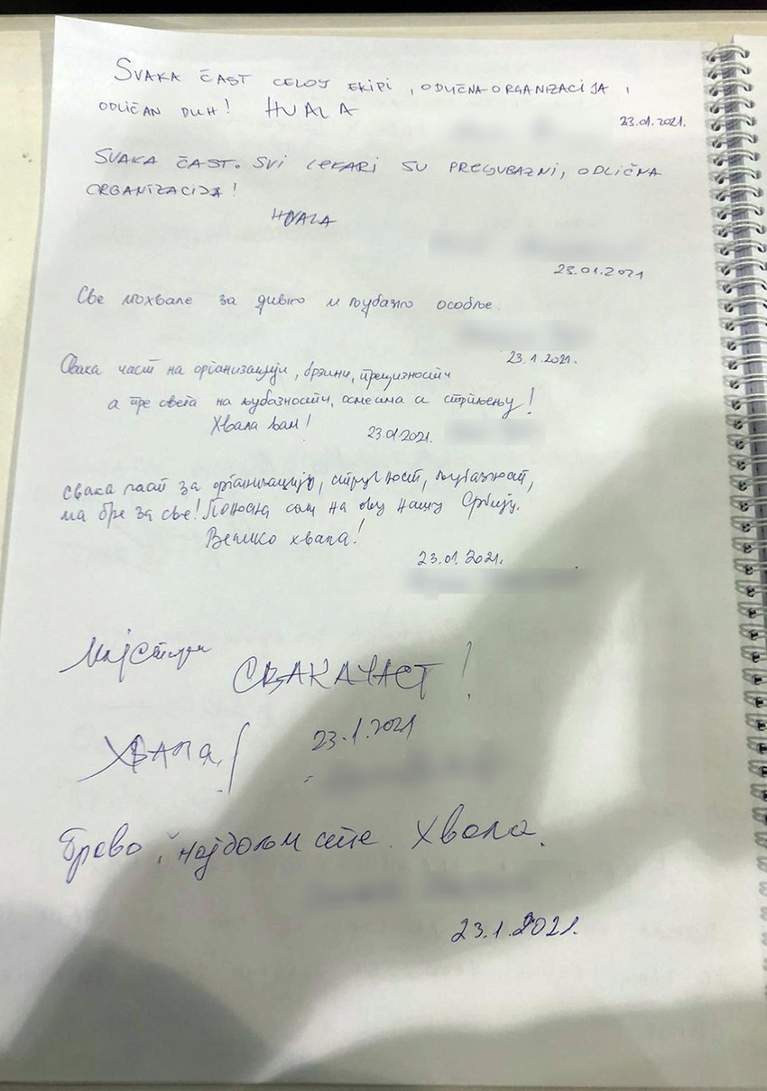 "Bravo!", "Svaka čast", "Bravo doktori" - i tako na svakoj stranici. Ovo su samo neke od izjava zahvalnosti i pohvala iz knjige utisaka koje su građani napisali nakon vakcinacije na Beogradskom sajmu.