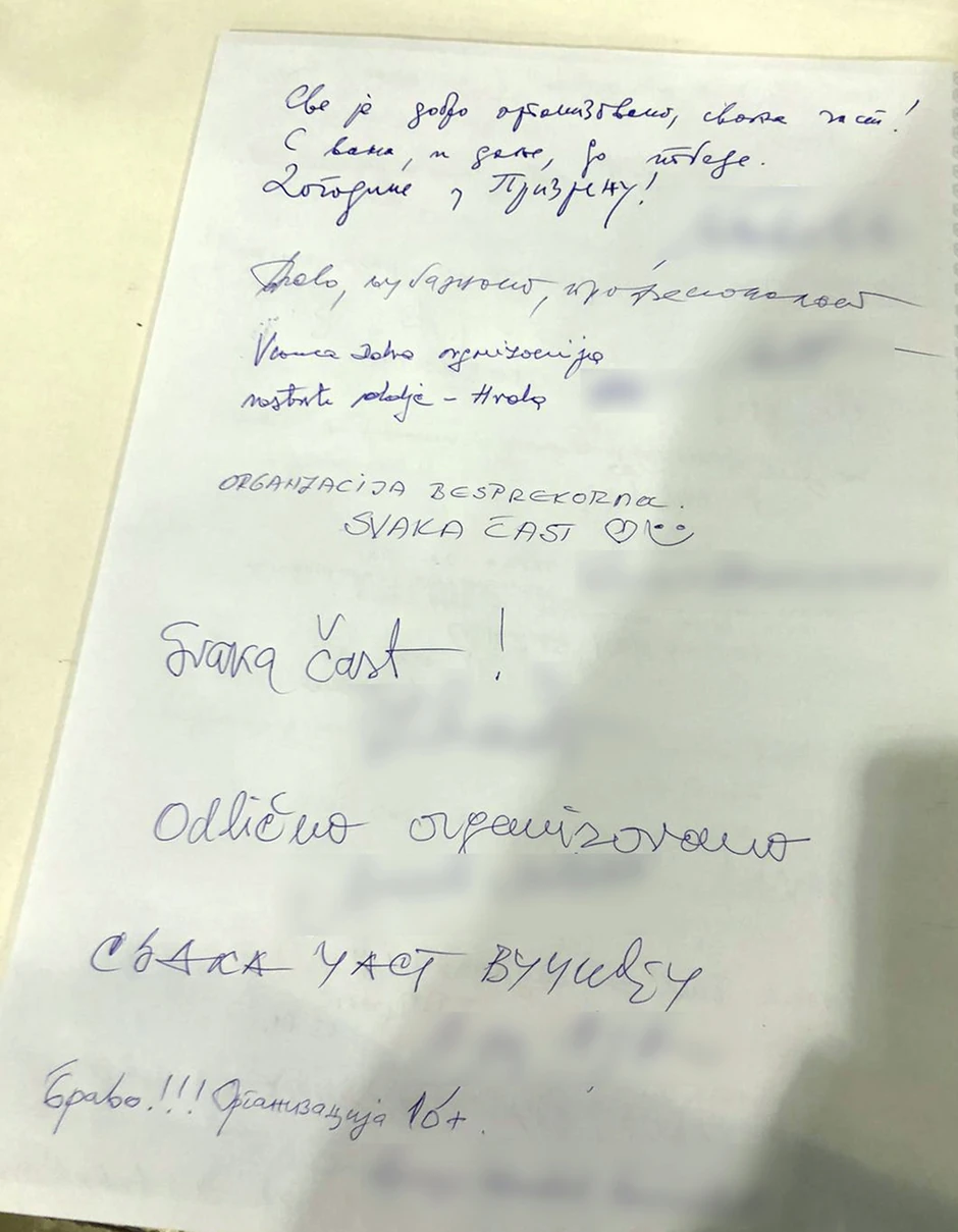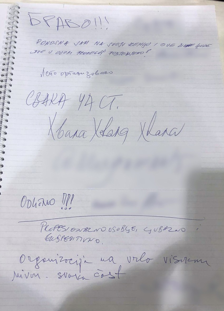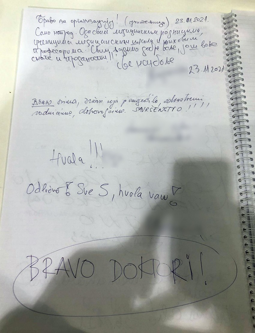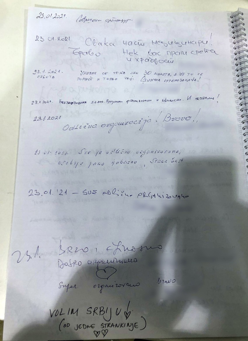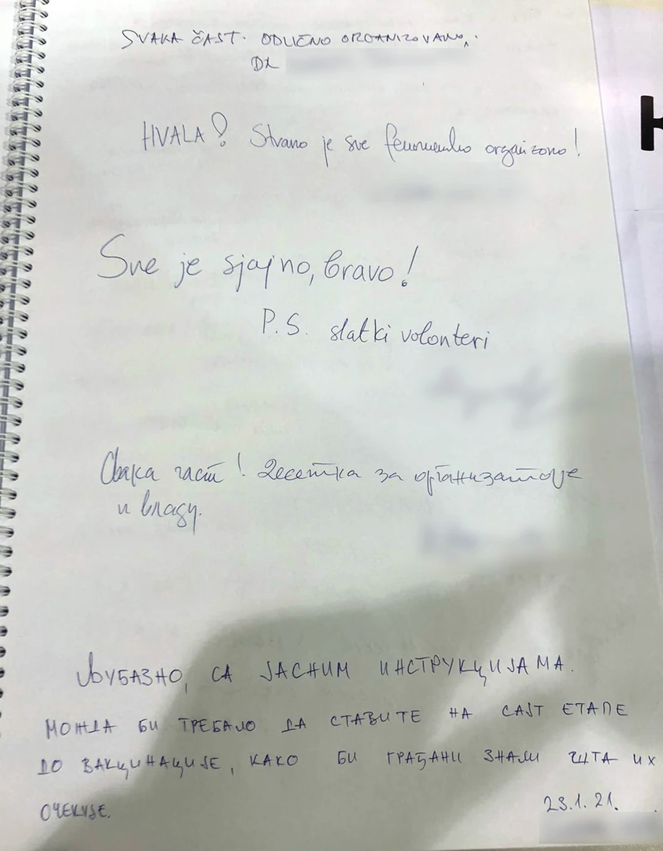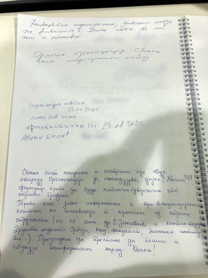 "Svaka čast lekarima i sestrama koji ovde izgaraju. Organizacija je iznenađujuće sjajna! Hvala!! Formular treba da bude latiničan/dvojezičan zbog stranih građana. Treba nam jasno informisanje i provakcinacijska kampanja na televiziji i mrežama od strane stručnjaka..."
