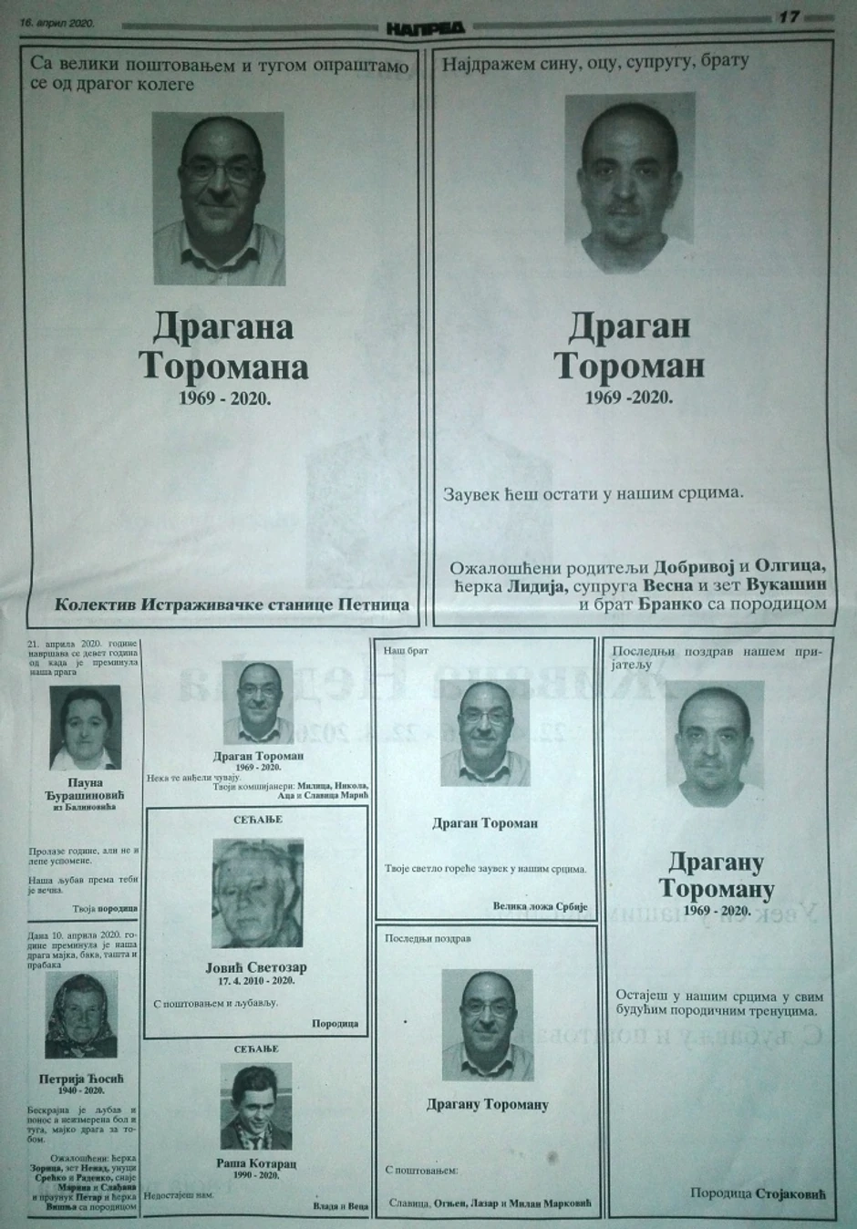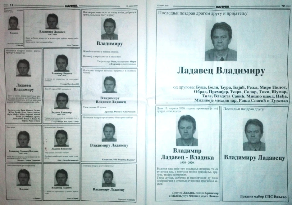 Veliki broj čitulja, između ostalih i od Istraživačke stanice Petnica i Velike lože Srbija, dobio je i Dragan Toroman (1969) rukovodilac programa računarstva u Petnici, jedan od najcenjenijih IT stručnjaka. Na nekoliko strana, pored porodice, veliki broj Valjevaca, privredni kolektivi, Grad Valjevo i njegov FK Budućnost, oprostili su se i od Vladimira Ladaveca, dugogodišnjeg privrednika i legendarnog golmana valjevske „stare dame“ iz njenih najuspešnijih dana.