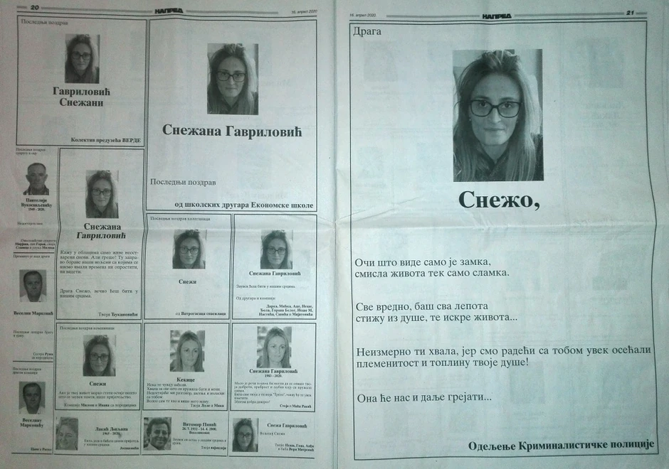 Na nekoliko strana, uz najemotivnije poruke i reči bola, su i čitulje tragično preminuloj Snežani Gavrilović (1983), šefici Odeljenja za suzbijanje opšteg kriminaliteta u Policijskoj upravi Valjevo, koja je izgubila bitku sa kancerom. „Oči što vide samo je zamka, smisla života tek samo slamka. Sve vredno, baš sva lepota, stižu iz duše, te iskre života“, napisale su u poslednjem pozdravu Snežani njene kolege.