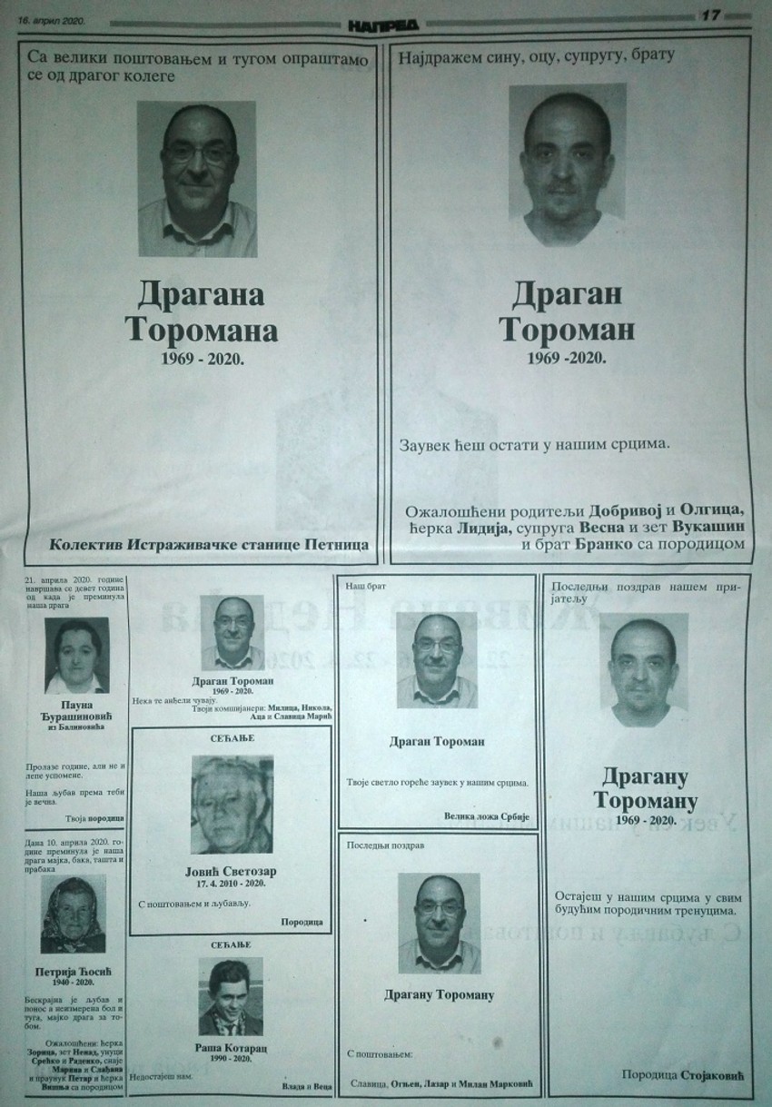 Čituljama u „Napredu“ su se porodica i prijatelji oprostili i od još jedne žrtve korona virusa, veroučitelja Predraga Jevtića (1981), kao i taksiste Gradskog taksija Ivice Gagića (1975).