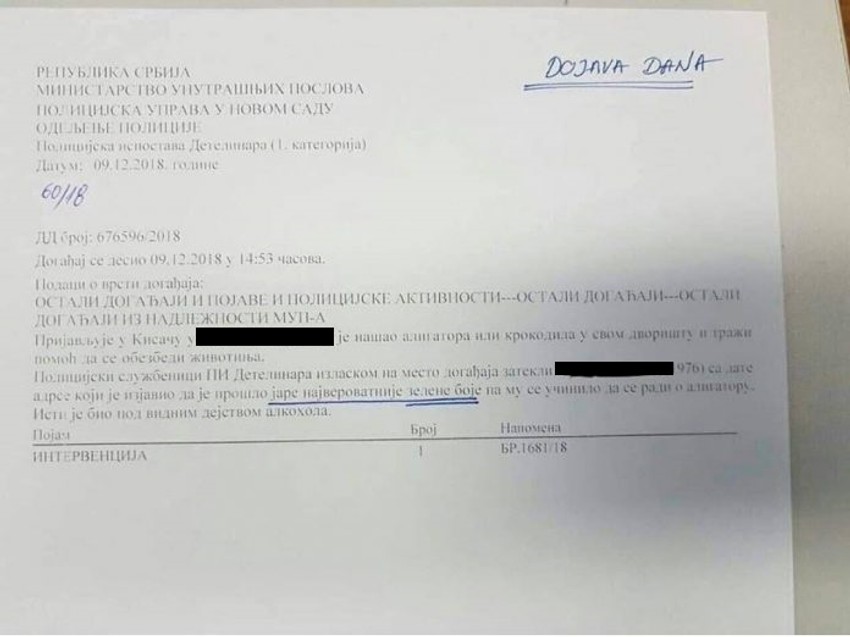No, slučaj kisačkog krokodila ipak je privukao pažnju u stanici, pa je ovaj izveštaj kako se vidi sa fotografije, proglašen za "dojavu dana".