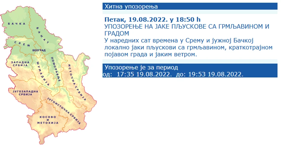"U narednih sat vremena u Sremu i južnoj Bačkoj lokalno jaki pljuskovi sa grmljavinom, kratkotrajnom pojavom grada i jakim vetrom", piše u hitnom upozorenju Republičkog hidrometeorološkog zavoda (RHMZ).