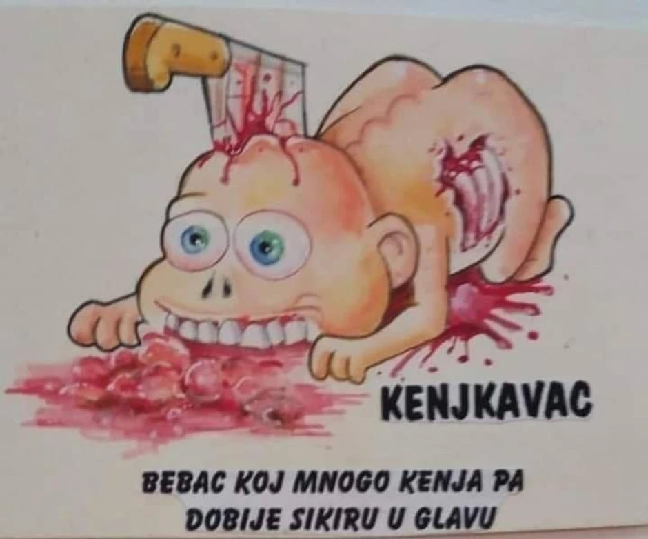 Na crtežu je, naime, beba sa sekirom u glavi, okolo puno krvi, deo tela koji nedostaje... a prati ga tekst: "Bebac koji mnogo kenja pa dobije sikiru u glavu."