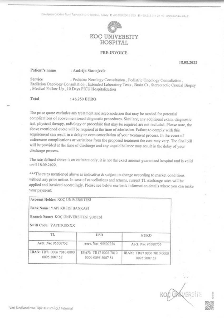Andrija mora hitno na operaciju u Кoc Universiti u Tursku. Potrebno je sakupiti 46.250 evra do 18.09. do kada važi predračun koji se nalazi u prilogu ovog mejla.