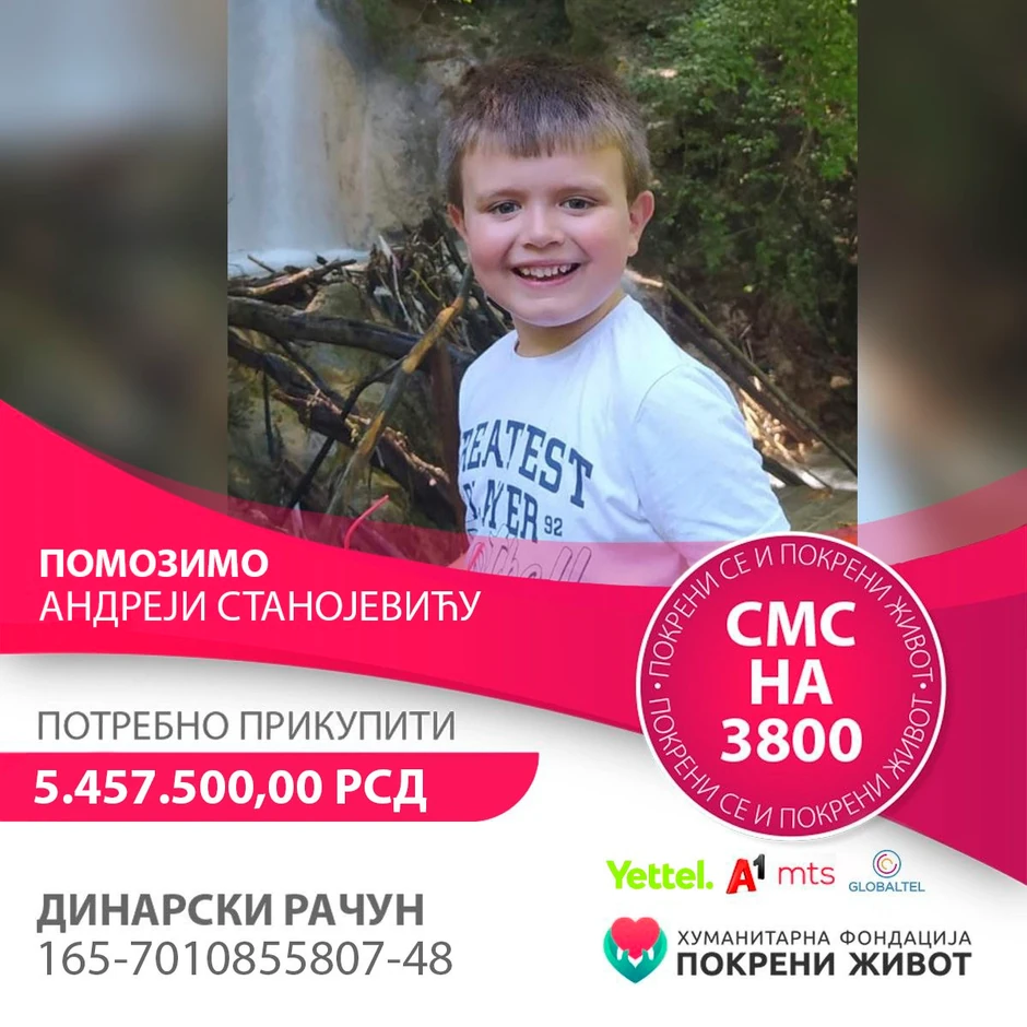 Andriji (8) iz Leskovca, koji je rođen kao zdrava beba, dijagnostikovan je tumor na mozgu. Dečak je potpuno izgubio vid i zdravstveno stanje mu je pogoršano, a za operaciju u Turskoj koja mu je jedini spas, potrebno mu je 46.250 evra i pomoć svih nas.