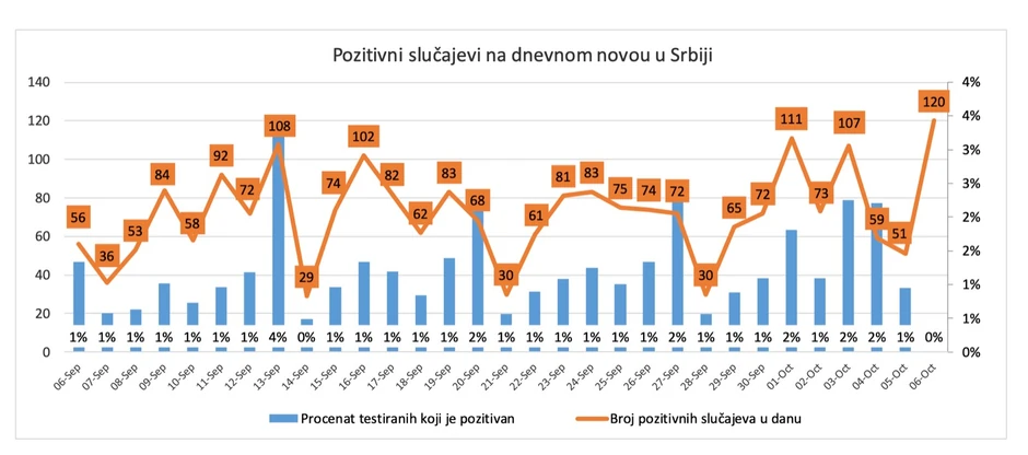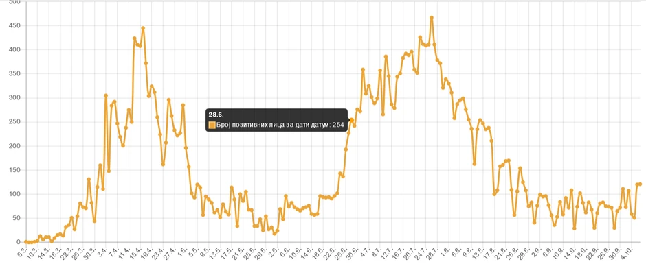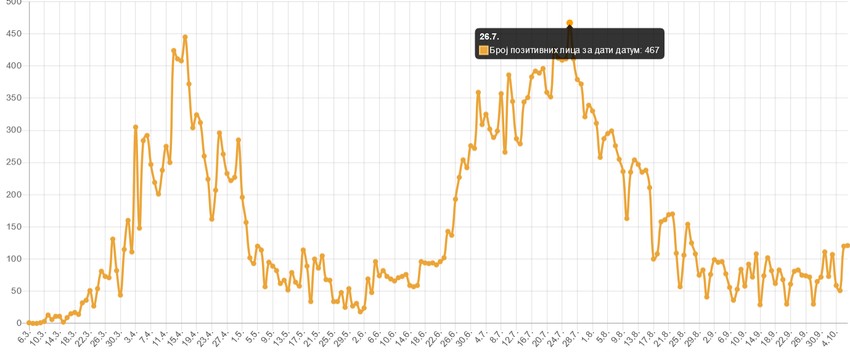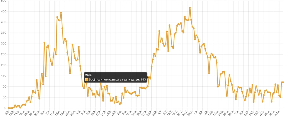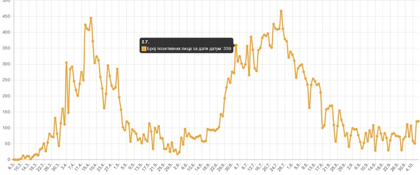 Kriva za septembar i oktobar izgleda ovako (možete da vidite na grafici ispod), s tim što smo 7. oktobra imali 121, a juče već 151.