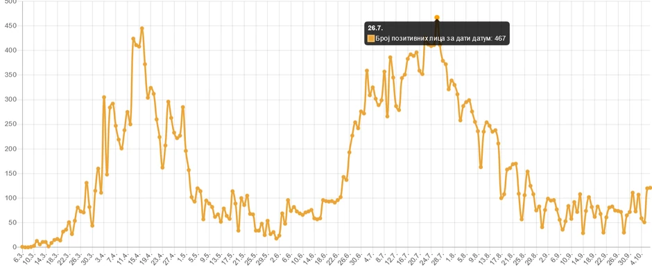 Sredinom juna broj novootrivenih slučajeva danima se kretao oko 100. Onda smo 23. juna zabeležili 102, samo dva dana kasnije, dakle 24. juna 143 (malo manje nego juče, kada brojimo 151), ponovo za dva dana "kriva" se diže na 193, 28. juna na čak 254, 3. jula skok na 359.... I sve tako brzinom munje do 467 novonaraženih 26. jula!