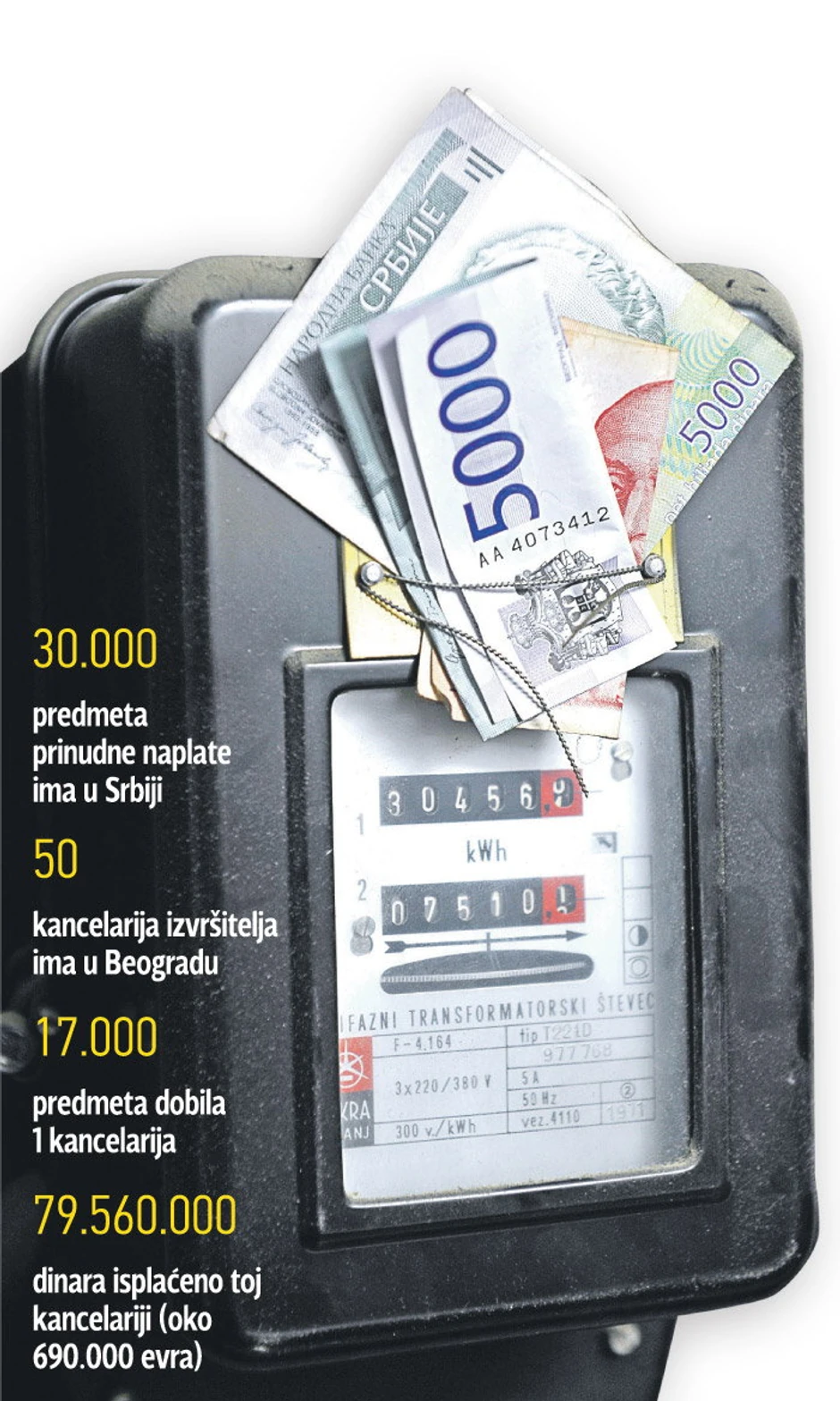 Prema našim saznanjima, zasad najdrastičniji primer koji se proverava odnosi se na jednu beogradsku izvršiteljsku kancelariju (ime poznato redakciji ali smo zamoljeni zbog istrage da je ne pominjemo). Ova kancelarija je od oko 30.000 predmeta utuženja građana dobila od JP „Elektrodistribucije“ čak - 17.000.