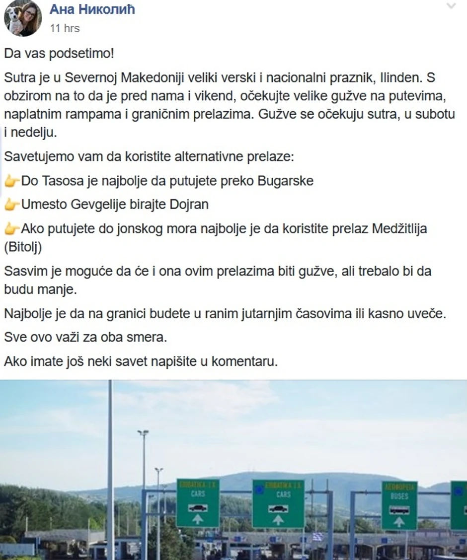 "Danas je u Severnoj Makedoniji veliki verski i nacionalni praznik, Ilinden. S obzirom na to da je pred nama i vikend, očekujte velike gužve na putevima, naplatnim rampama i graničnim prelazima. Gužve se očekuju sutra, u subotu i nedelju", navodi se na Fejsbuk stranici LIVE from Greece.