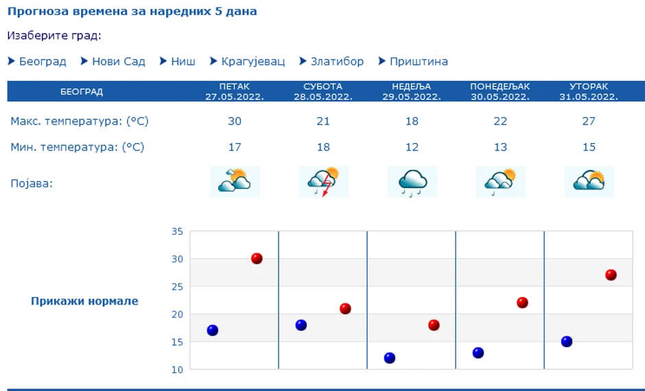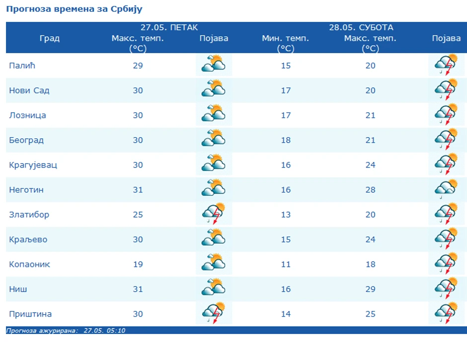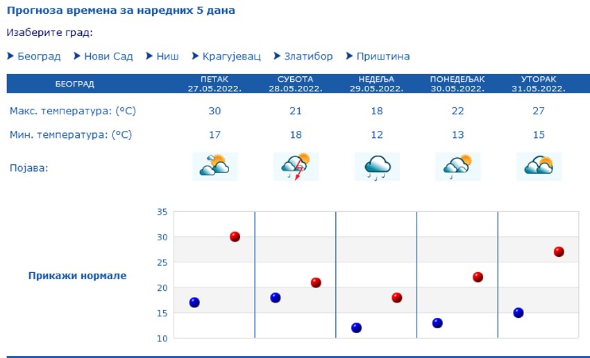 Jutarnja temperatura iznosiće od 12 do 17, najviša dnevna od 27 do 32 stepena. Krajem dana i u toku noći u severnim i zapadnim krajevima se očekuje jače naoblačenje koje će usloviti mestimično kišu, pljuskove sa grmljavinom i pojačan severni i severozapadni vetar.