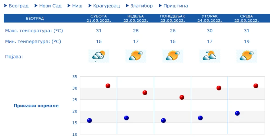 Maksimalna dnevna će još u ponedeljak biti oko 27 stepeni, svežije, ali i dalje iznad proseka. Od utorka počinja da duva južni vetar, što nam donosi novo otopljenje. Sredinom nedelje živa u termometru će se kretati oko 30. podeljka, a krajem sedmice, sa kišom stiže i blaži pad temperature.
