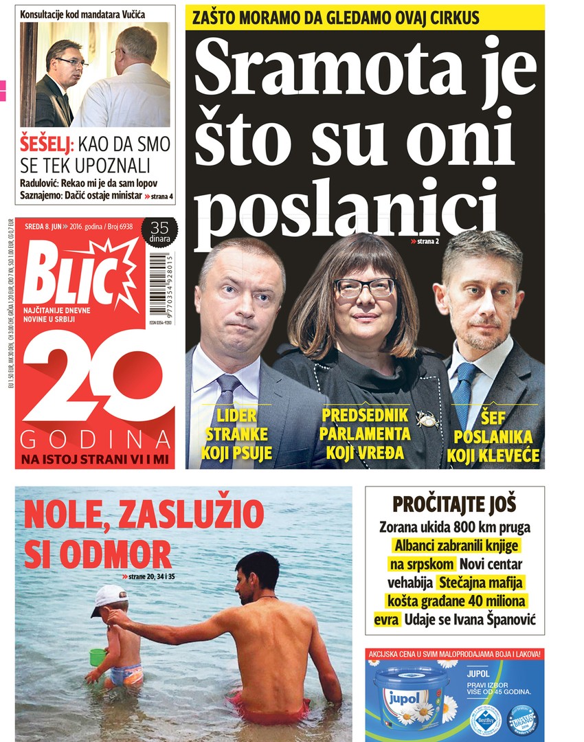 Bavili smo se i temom "Sramota je što su oni poslanici": Lider stranke koji psuje, Predsednik parlamenta koji vređa, šef poslanika koji kleveće... a pročitajte i tekstove: "Albanci zabranili knjige na sprskom", "Zorana ukida 800 km pruga", "Stečajna mafija košta građane 40 miliona evra"...