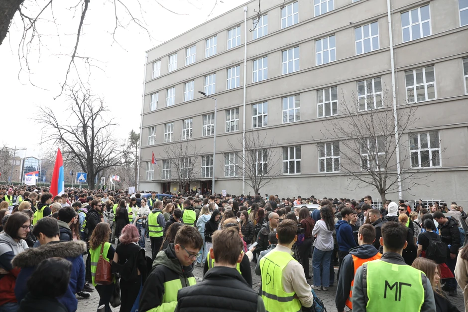 U isto vreme ispred škole je u toku protest, na kome su se okupili profesori, đaci i roditelji.