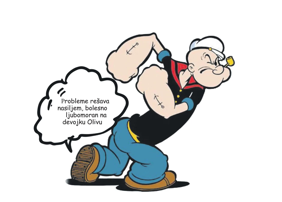 Ponašanje Mornara Popaja bez sumnje je nasilničko, kao kod nekog viđenijeg zaštićenog svedoka. Skoro da nema strip avanture gde on problem ne rešava pesnicama i čim pojede spanać - nekog prebije, a najčešće Badžu. Odnos prema Olivi je posesivan i bolesno ljubomoran. Pa, koja bi živela sa njim?