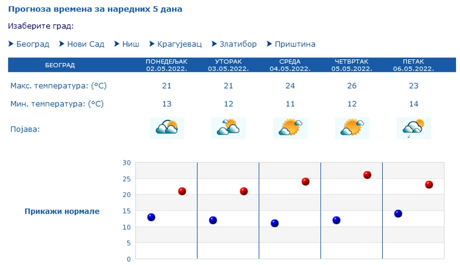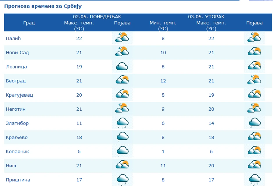 Umereno do potpuno oblačno, u zapadnoj i južnoj Srbiji mestimično sa kišom. Na severu i istoku sa sunčanim intervalima. Vetar slab i umeren, u košavskom području povremeno jak jugoistočni i istočni. Najniža temperatura od 7 do 13 °S, najviša od 17 do 22 °S.