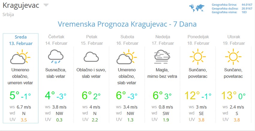 - Duvaće slab do umeren severozapadni vetar, koji će na planinama i na istoku zemlje biti jak. Jutarnja temperatura kretaće se od minus 5 stepeni na jugu države do 3 stepena na severu. Maksimalna dnevna temperatura na jugu Srbije iznosiće 4 stepena, a na severu 10 stepeni - najave su meteorologa Đorđa Đurića.