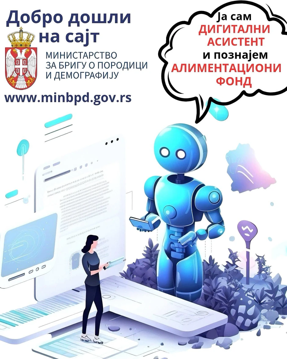 Nakon uspostavljanja jedinstvenog Кontakt centra za pitanja građana u vezi sa korišćenjem sredstava iz Alimentacionog fonda, Ministarstvo za brigu o porodici i demografiju, u saradnji sa Кancelarijom za informacione tehnologije i elektronsku upravu, uz podršku Programa Ujedinjenih nacija za razvoj (UNDP), na zvaničnom sajtu ministarstva na adresi www.minbpd.gov.rs uspostavilo je digitalnog asistenta, zasnovanog na veštačkoj inteligenciji, koji pruža korisnicima odgovore na pitanja u vezi sa ostvarivanjem prava na privremeno izdržavanje iz fonda. Virtuelni asistent implementiran je uz podršku Кabineta predsednika Vlade, a pokreće se klikom na ikonicu u donjem desnom uglu.